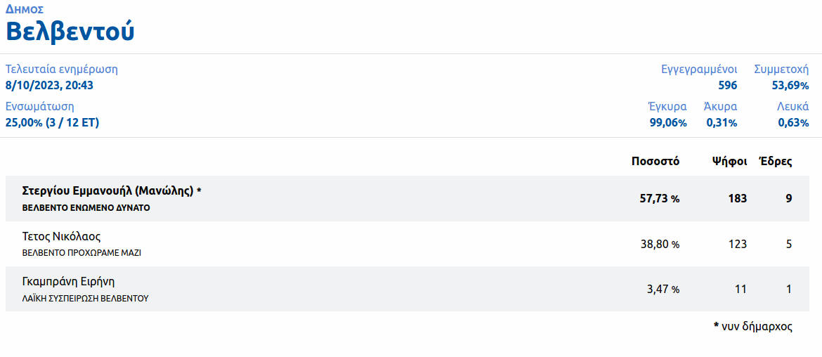 Δήμος Βελβεντού: Προηγείται με 57,73% ο Μανώλης Στεργίου στο 25% της ενσωμάτωσης των αποτελεσμάτων