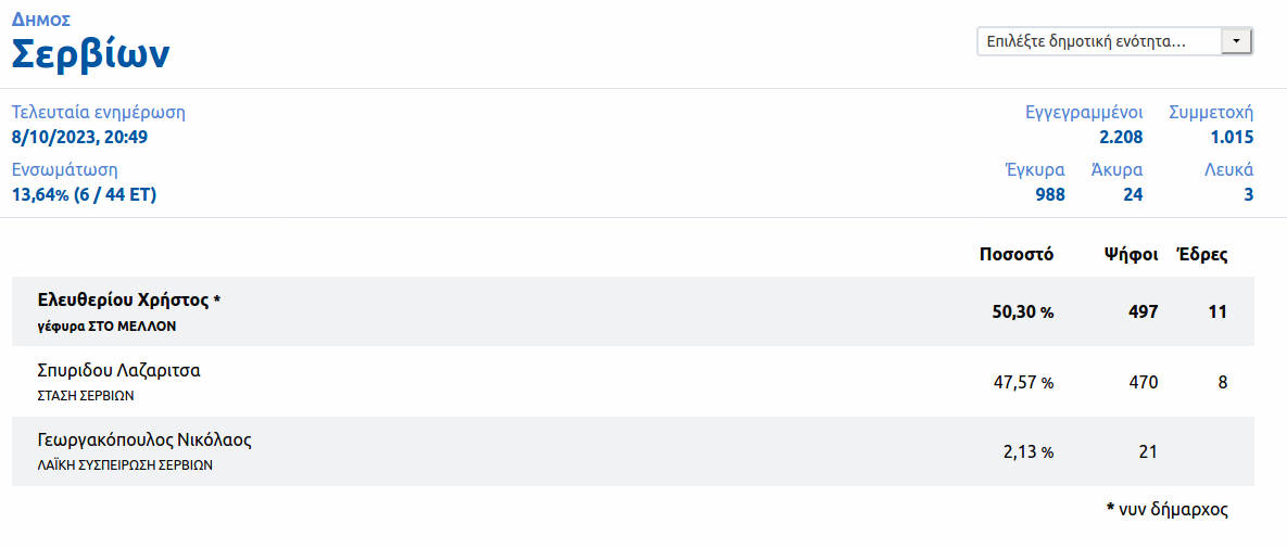 Αυτοδιοίκηση, Σέρβια - Βελβεντό 08/10/2023 Ντέρμπι και στον Δήμο Σερβίων: Μπροστά με 27 ψήφους ο Χ. Ελευθερίου έναντι της Ρ. Σπυρίδου στο 13,64% της ενσωμάτωσης 0 Ντέρμπι και στον Δήμο Σερβίων: Μπροστά με 27 ψήφους ο Χ. Ελευθερίου έναντι της Ρ. Σπυρίδου στο 13,64% της ενσωμάτωσης