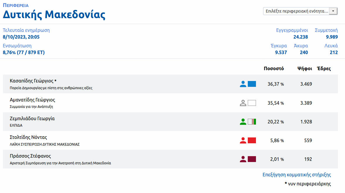 Αυτοδιοίκηση 08/10/2023 «Ντέρμπι» στην Περιφέρεια Δυτικής Μακεδονίας με καταμετρημένο το 8,76% των Εκλογικών Τμημάτων 0 «Ντέρμπι» στην Περιφέρεια Δυτικής Μακεδονίας με καταμετρημένο το 8,76% των Εκλογικών Τμημάτων. Δείτε τα πρώτα συγκεντρωτικά αποτελέσματα: