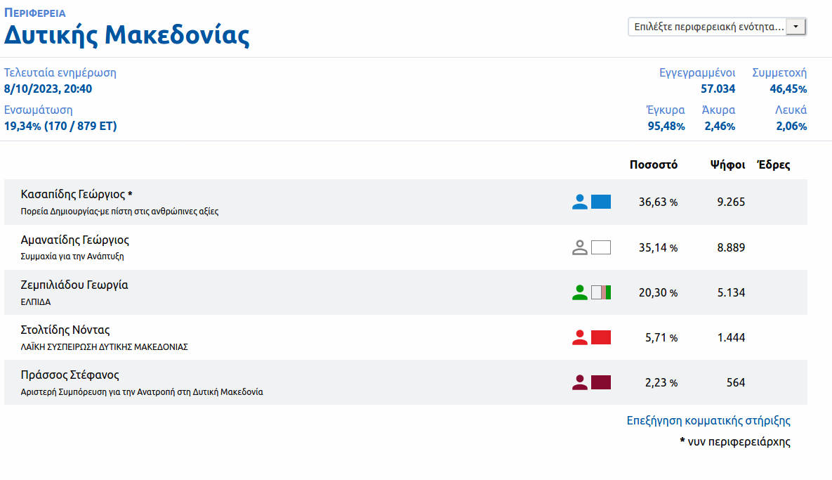 Αυτοδιοίκηση 08/10/2023 Προβάδισμα Κασαπίδη στο 19% της ενσωμάτωσης – Σε ποιες Π.Ε. προηγούνται Αμανατίδης και Κασαπίδης 0 Προβάδισμα Κασαπίδη στο 19,34% της ενσωμάτωσης. Ο νυν Περιφερειάρχης μέχρι στιγμής προηγείται στις Π.Ε. Γρεβενών και Φλώρινας ενώ ο Γιώργος Αμανατίδης προηγείται σε Καστοριά και οριακά στην Π.Ε. Κοζάνης.
