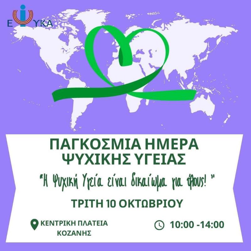 Στα πλαίσια της Παγκόσμιας Ημέρας Ψυχικής Υγείας, που τιμάται στις 10 Οκτωβρίου κάθε έτους, οι δομές της Ε.Ψ.Υ.Κ.Α στους Νομούς Κοζάνης & Γρεβενών, η Κινητή Μονάδα Ψυχικής Υγείας, τα προγράμματα Υπηρεσιών Κατ΄οίκον Νοσηλείας & Παιδοψυχιατρικών Υπηρεσιών, το Δ’ Ψυχογηριατρικό Οικοτροφείο Σερβίων & το Προστατευόμενο Διαμέρισμά του, διοργανώνουν δράση ενημέρωσης και ευαισθητοποίησης των πολιτών, την Τρίτη 10 Οκτωβρίου 2023 στην Κεντρική Πλατεία της Κοζάνης και ώρες 10:00-14:00