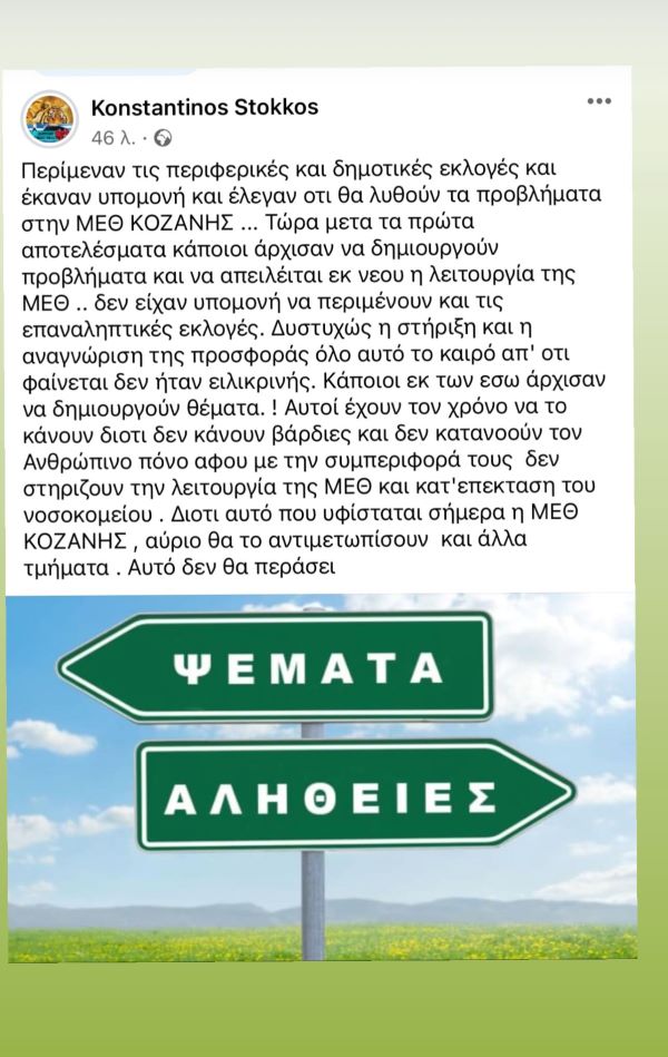 Περίμεναν τις περιφερικές και δημοτικές εκλογές και έκαναν υπομονή και έλεγαν ότι θα λυθούν τα προβλήματα στην ΜΕΘ ΚΟΖΑΝΗΣ … Τώρα μετά τα πρώτα αποτελέσματα κάποιοι άρχισαν να δημιουργούν προβλήματα και να απειλείται εκ νέου η λειτουργία της ΜΕΘ .. δεν είχαν υπομονή να περιμένουν και τις επαναληπτικές εκλογές. Δυστυχώς η στήριξη και η αναγνώριση της προσφοράς όλο αυτό το καιρό απ’ ότι φαίνεται δεν ήταν ειλικρινής.