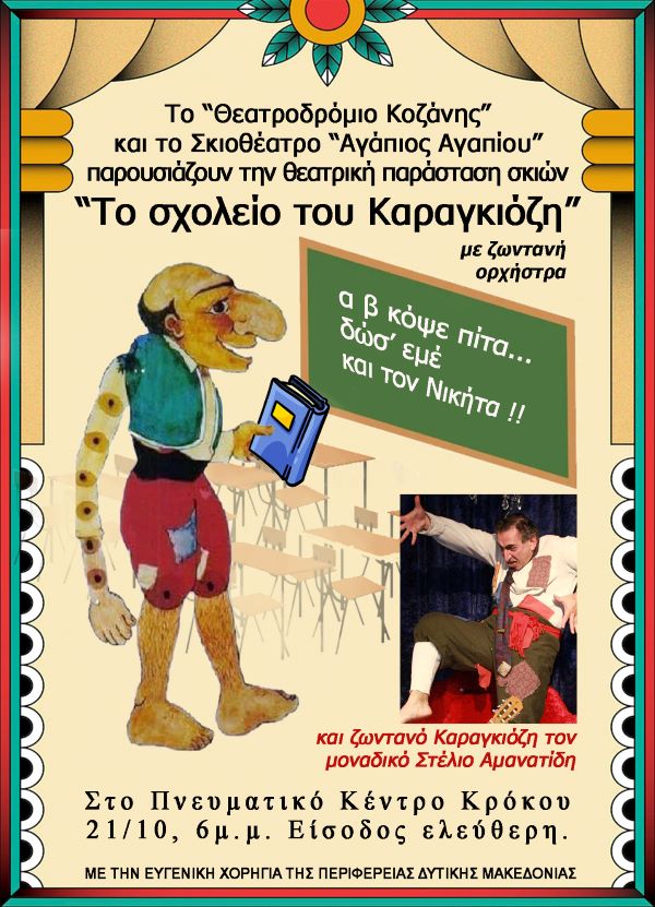 Με μοναδικό σκοπό, την γνωριμία των παιδιών με το παραδοσιακό Λαϊκό Θέατρο Σκιών και τις τεχνικές του, το Θεατροδρόμιο Κοζάνης σε συνεργασία με το σκιοθέατρο του αναγνωρισμένου Καραγκιοζοπαίχτη Αγάπιο Αγαπίου και τη συνοδεία ζωντανής ορχήστρας, θα περιοδεύσει σε κοινότητες της Π.Ε. Κοζάνης με την παράσταση “Το σχολείο του Καραγκιόζη”.