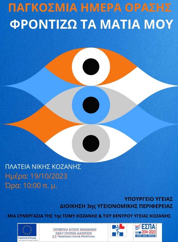 Κοζάνη 18/10/2023 Δράση για την Παγκόσμια Ημέρα Όρασης στην κεντρική πλατεία Κοζάνης 0 Δράση για την Παγκόσμια Ημέρα Όρασης διοργανώνει στην κεντρική πλατεία Κοζάνης το Υπουργείο Υγείας, η Διοίκηση 3ης Υγειονομικής Περιφέρειας σε συνεργασία ε την 1ης ΤΥΜΥ Κοζάνης και του Κέντρου Υγείας Κοζάνης.