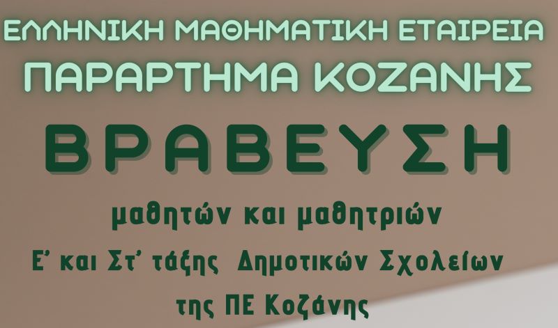 Το Παράρτημα Κοζάνης της Ελληνικής Μαθηματικής Εταιρείας θα τιμήσει και φέτος τα παιδιά της Π.Ε. Κοζάνης, που προκρίθηκαν στον 17ο Μαθηματικό Διαγωνισμό της Ε.Μ.Ε. «Παιχνίδι και Μαθηματικά».