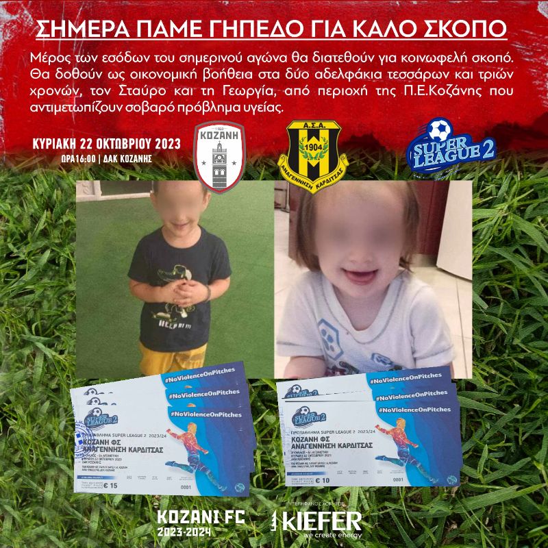 Η ΠΑΕ ΦΣ ΚΟΖΑΝΗ ενημερώνει τους φιλάθλους της. Ενόψει του εντός έδρας αγώνα της 5ης αγωνιστικής ημέρας του Α΄ Ομίλου του Πρωταθλήματος SUPER LEAGUE 2, αγωνιστικής περιόδου 2023-2024, μεταξύτων ομάδων Π.Α.Ε ΚΟΖΑΝΗΣ Φ.Σ. και ΠΑΕ ΑΝΑΓΕΝΝΗΣΗ ΚΑΡΔΙΤΣΑΣ, σήμερα Κυριακή 22/10 στις 16:00 στο ΔΑΚ Κοζάνης, ότι μέρος των εσόδων του