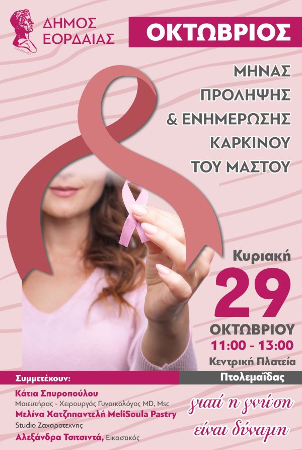 Ενημερωτική δράση, με αφορμή την Παγκόσμια Ημέρα Πρόληψης του Καρκίνου του Μαστού, διοργανώνει ο Δήμος Εορδαίας την Κυριακή 29 Οκτωβρίου από 11.00-13.00, στην Κεντρική Πλατεία της Πτολεμαΐδας. Συμμετέχουν η Μαιευτήρας – Χειρουργός Γυναικολόγος Κάτια Σπυροπούλου MD, Msc, το Studio Ζαχαροτέχνης Μελίνας Χατζηπαντελή MeliSoula Pastry και η Εικαστικός Αλεξάνδρα Τσιτσιντά.