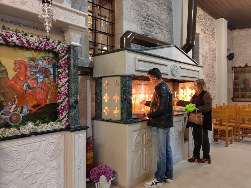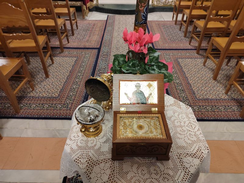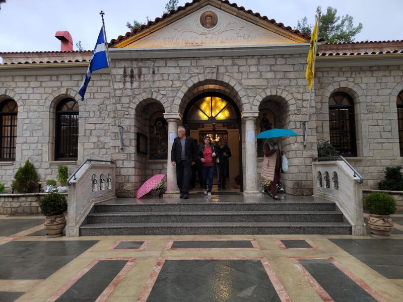 Την ώρα εκείνη δεν θα ήταν περισσότεροι από τριάντα με σαράντα άνθρωποι στον ναό. Μια ομήγυρις περίπου δέκα γυναικών, μπροστά στην λάρνακα, έψελνε την παράκληση του Αγίου. Μοναδικός κληρικός που παρευρισκόταν, ο διάκονος του ιερού ναού.