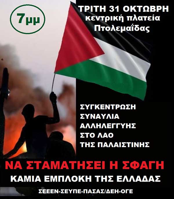 Τα σωματεία και οι φορείς που υπογράφουμε το παρών κάλεσμα καλούμε το λαό και τη νεολαία της Εορδαίας να πάρουν μαζικά μέρος στη συγκέντρωση-συναυλία αλληλεγγύης στον αγωνιζόμενο Λαό της Παλαιστίνης, την Τρίτη 31 Οκτώβρη στις 7μμ στην κεντρική πλατεία Πτολεμαΐδας.