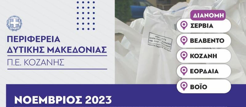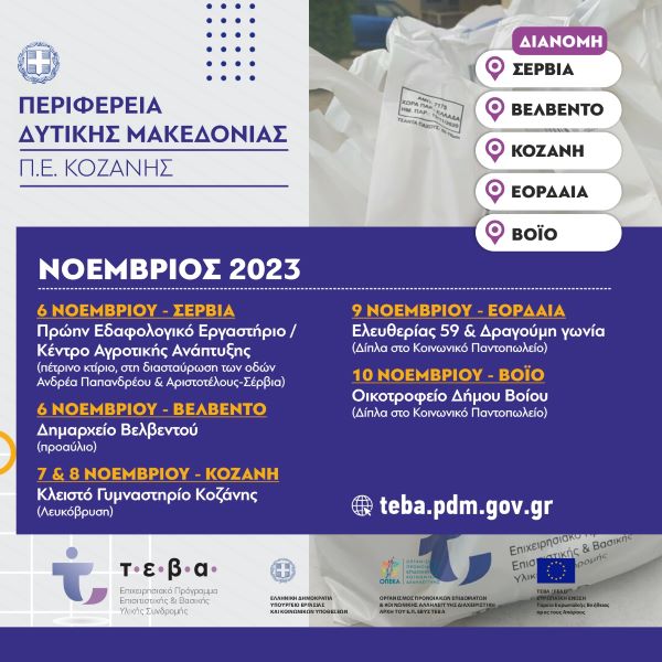 Η Περιφερειακή Ενότητα  Κοζάνης ως επικεφαλής εταίρος της Κοινωνικής Σύμπραξης ΤΕΒΑ που έχει συσταθεί για το Νομό μας ανακοινώνει ότι θα πραγματοποιηθεί, σε συνεργασία με τους Δήμους Κοζάνης, Βοΐου, Εορδαίας, Σερβίων και Βελβεντού, διανομή τροφίμων του «Επιχειρησιακού Προγράμματος Επισιτιστικής και Βασικής Υλικής Συνδρομής ΤΕΒΑ» στους δικαιούχους του προγράμματος, τις παρακάτω ημέρες  :