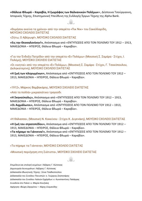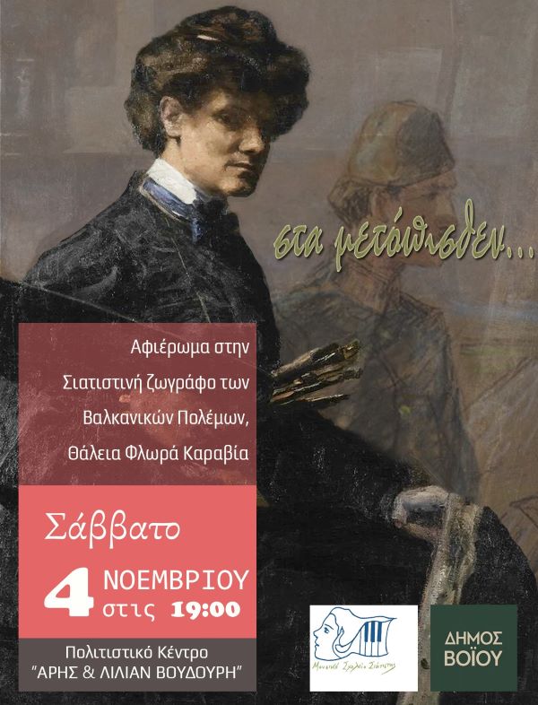 Το Σάββατο 4 Νοεμβρίου 2023, ανήμερα της 11ηςΕπετείου της Μάχης της Σιάτιστας, το απόγευμα στις 7, στο Πολιτιστικό Κέντρο Σιάτιστας «ΑΡΗΣ & ΛΙΛΙΑΝ ΒΟΥΔΟΥΡΗ» θα παρουσιαστεί το αφιέρωμα στην Σιατιστινή ζωγράφο των Βαλκανικών Πολέμων Θάλεια Φλωρά – Καραβία με τίτλο «ΣΤΑ ΜΕΤΟΠΙΣΘΕΝ».