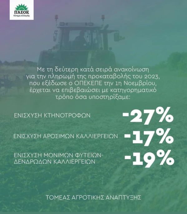 Με τη δεύτερη κατά σειρά ανακοίνωση για την πληρωμή της προκαταβολής του 2023, που εξέδωσε ο ΟΠΕΚΕΠΕ την 1η Νοεμβρίου, έρχεται να επιβεβαιώσει με κατηγορηματικό τρόπο όσα υποστηρίξαμε ως ΠΑΣΟΚ – Κίνημα Αλλαγής. Ο ΟΠΕΚΕΠΕ κάνει σαφές ότι «υλοποιεί απαρέγκλιτα την απόφαση της Κυβέρνησης», ότι «υπήρξαν καθυστερήσεις στην έκδοση των υπουργικών αποφάσεων και προβληματική τεχνική υποστήριξη», ότι «ο ΟΠΕΚΕΠΕ δε νομοθετεί, υλοποιεί τις υπουργικές αποφάσεις και λοιπές κανονιστικές πράξεις». Ο ΟΠΕΚΕΠΕ επισημαίνει ότι υλοποιεί το εγκεκριμένο στρατηγικό σχεδίου, το οποίο κατατέθηκε στην Ε.Ε. από την παρούσα Κυβέρνηση και προβλέπει μείωση της βασικής ενίσχυσης από 1 δισεκ. ευρώ το 2022 σε 829 εκ. ευρώ το 2023.