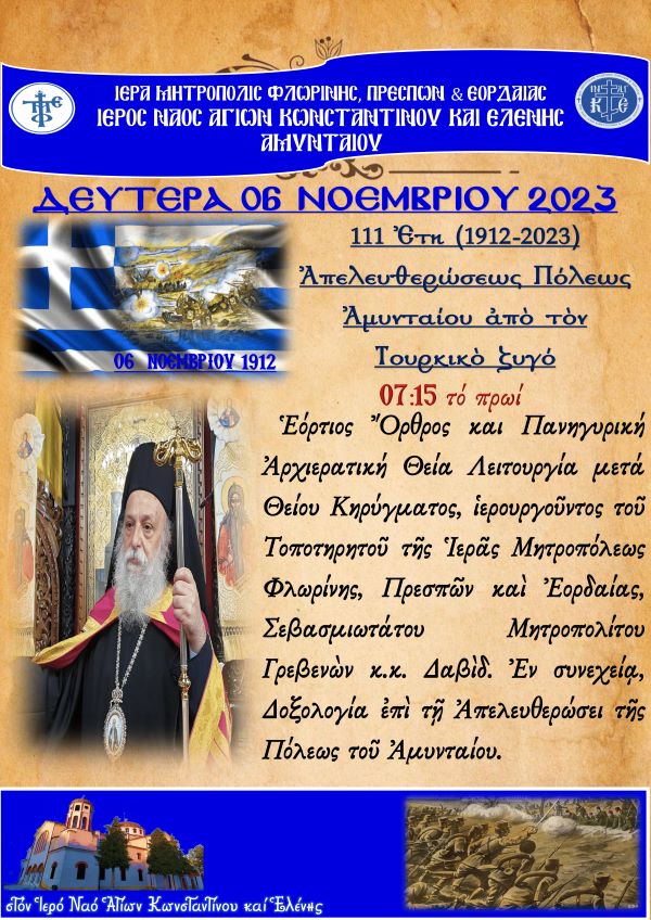 Δυτική Μακεδονία 04/11/2023 Ο Μητροπολίτης Γρεβενών κ.κ. Δαβίδ θα ιερουργήσει στον Ι.Ν. Αγ. Κων/νου & Ελένης Αμυνταίου με αφορμή τα ελευθέρια της πόλεως 0 Ο Μητροπολίτης Γρεβενών κ.κ. Δαβίδ θα ιερουργήσει στον Ι.Ν. Αγ. Κων/νου & Ελένης Αμυνταίου με αφορμή τα ελευθέρια της πόλεως.