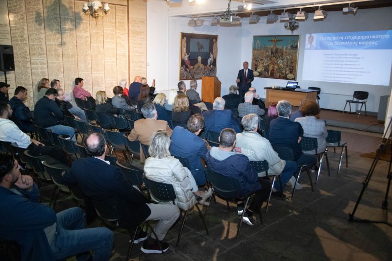 Μεταφέροντας την εμπειρία πετυχημένων επιχειρηματιών και μιλώντας με απλή και κατανοητή γλώσσα, στάθηκε ιδιαίτερα στη φθίνουσα πορεία της οικονομίας και των επιχειρήσεων, επισημαίνοντας: «Στη δύσκολη οικονομικά περίοδο που διανύουμε, στην αγορά θα παραμείνουν οι επιχειρήσεις που θα ξέρουν να λειτουργούν καλύτερα. Αυτές θα είναι οι επιχειρήσεις, που οι άνθρωποί τους θα γνωρίζουν περισσότερα και θα κάνουν περισσότερα».