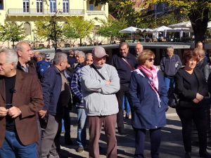 ‘Καλούμε τον κόσμο σε αγώνες, στις 24 του Νοέμβρη να βουλιάξει και να χαθεί η αντιλαϊκή πολιτική των κυβερνήσεων που εφαρμόζονται μέχρι σήμερα’ τόνισε μεταξύ άλλων στη συγκέντρωση ο Γενικός Γραμματέας της Ομοσπονδίας Συνταξιούχων ΙΚΑ Ελλάδας, Πάλμος Παναγιώτης.
