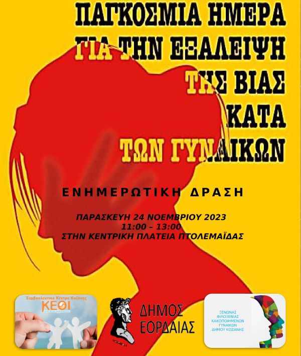 Δράση ενημέρωσης – ευαισθητοποίησης για την εξάλειψη της βίας κατά των Γυναικών θα πραγματοποιηθεί αύριο Παρασκευή 24 Νοεμβρίου, στην κεντρική πλατεία της Πτολεμαΐδας από 11:00 – 13:00, με πρωτοβουλία του Συμβουλευτικού Κέντρου Κοζάνης του Κέντρου Ερευνών για Θέματα Ισότητας (ΚΕΘΙ) σε συνεργασία με τον Δήμο Εορδαίας και με τη συμμετοχή του Ξενώνα Φιλοξενίας Κακοποιημένων Γυναικών του Δήμου Κοζάνης, στο πλαίσιο της Παγκόσμιας Ημέρας για την Εξάλειψη της Βίας κατά των Γυναικών που έχει οριστεί η 25η Νοεμβρίου.