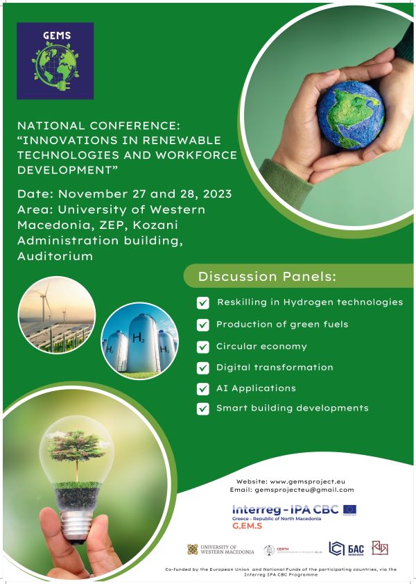 Στις 27 και 28 Νοεμβρίου 2023 θα πραγματοποιηθεί διημερίδα με τίτλο “Innovations in Renewable Technologies and Workforce Development”, που διοργανώνεται στο πλαίσιο του έργου “Stimulating Green Employment: Across Border Educational and Technological Innovation Hot – Spots” στο αμφιθέατρο του κτηρίου Διοίκησης της νέας πανεπιστημιούπολης στην ΖΕΠ Κοζάνης.