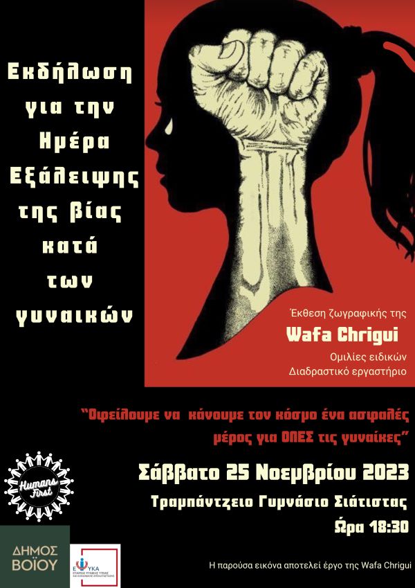 Ο Δήμος Βοΐου σε συνεργασία με την άτυπη ομάδα νέων Σιάτιστας «Humans First» διοργανώνει εκδήλωση με αφορμή την Ημέρα Εξάλειψης της Βίας κατά των Γυναικών, το Σάββατο 25 Νοεμβρίου 2023, ώρα 18:30, στο Τραμπάντζειο Γυμνάσιο Σιάτιστας.