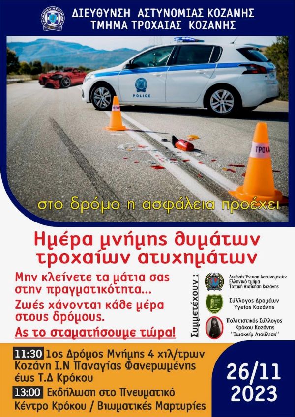 Η Διεύθυνση Αστυνομίας Κοζάνης, με αφορμή την «Παγκόσμια Ημέρα Μνήμης για τα Θύματα Τροχαίων Ατυχημάτων», διοργανώνει τον 1ο Δρόμο Μνήμης 4 χιλιομέτρων τιμώντας τη μνήμη όσων έχασαν την ζωή τους από Τροχαία Δυστυχήματα, ενώ θα ακολουθήσει διάλεξη στην αίθουσα εκδηλώσεων «Ιωακείμ Λιούλια» του πνευματικού Κέντρου Κρόκου Κοζάνης.