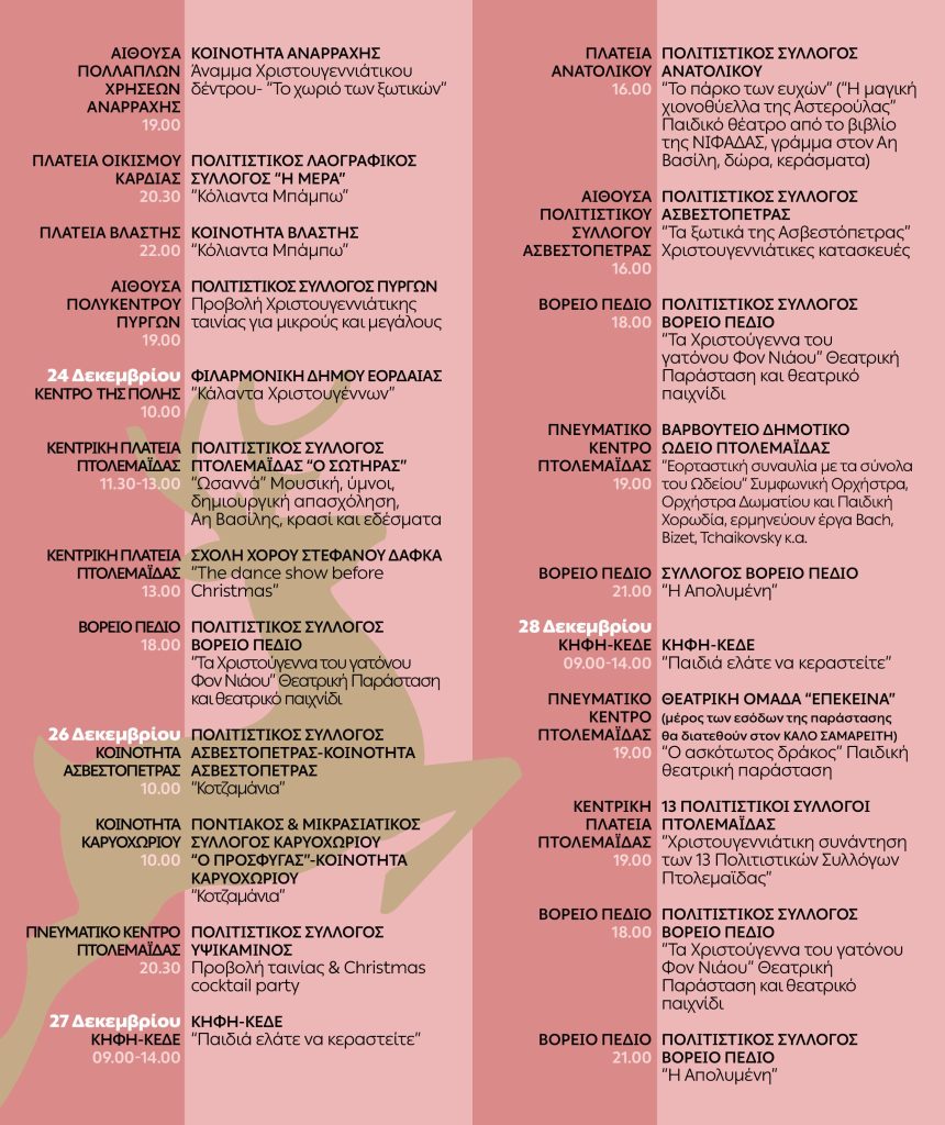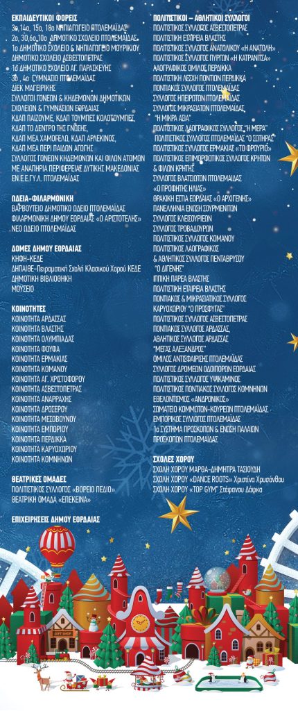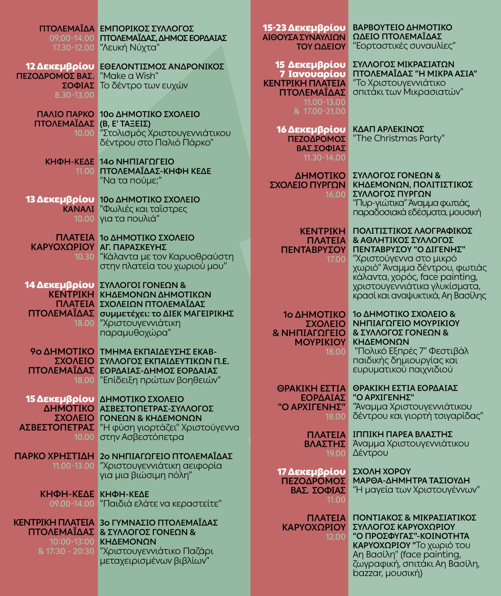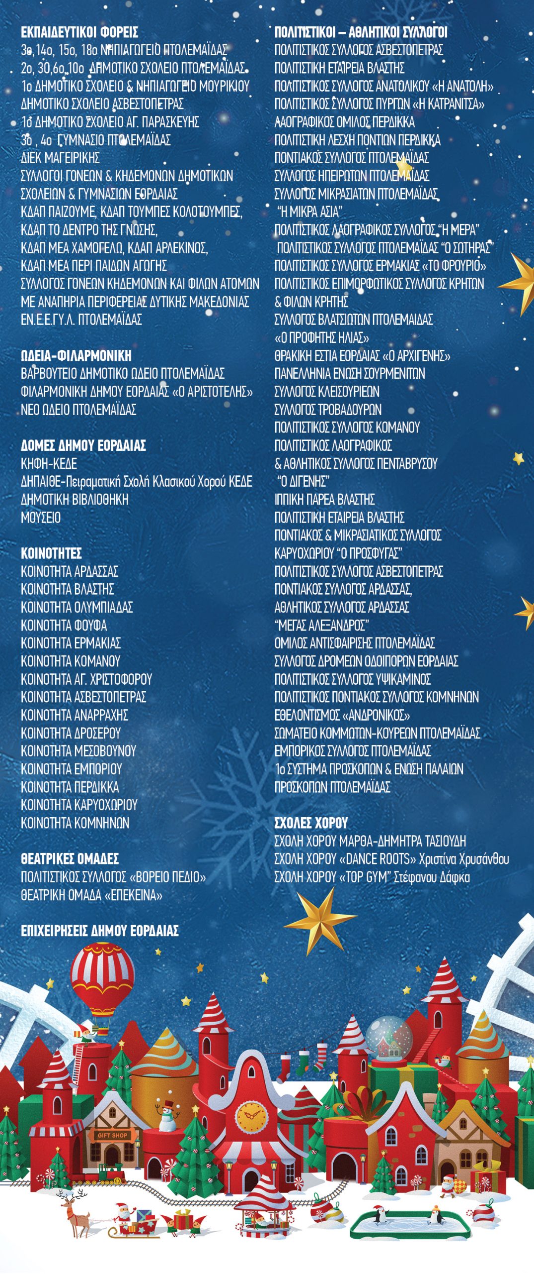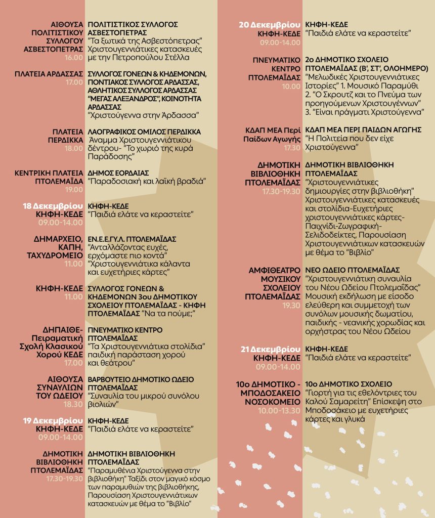 Κέφι, δράση και δημιουργία για μικρούς και μεγάλους, υπόσχεται το εορταστικό πρόγραμμα που ετοίμασε για τα φετινά Χριστούγεννα ο Δήμος Εορδαίας, σε συνεργασία με τις Τοπικές Κοινότητες και φορείς του Δήμου, με την επωνυμία «Νιφάδα τι Πτολεμα …είδες;», το οποίο παρουσιάστηκε σε συνέντευξη τύπου σήμερα Παρασκευή από τον Δήμαρχο Εορδαίας Παναγιώτη Πλακεντά, τον πρόεδρο του Εμπορικού Συλλόγου Πτολεμαΐδας – Εορδαίας Θεόδωρο Βυθούλκα και τον εντεταλμένο σύμβουλο του Δήμου σε θέματα Πολιτισμού Δημήτριο Καρακασίδη, οι οποίοι απηύθυναν κάλεσμα συμμετοχής σε όλο τον κόσμο της ευρύτερης περιοχής.