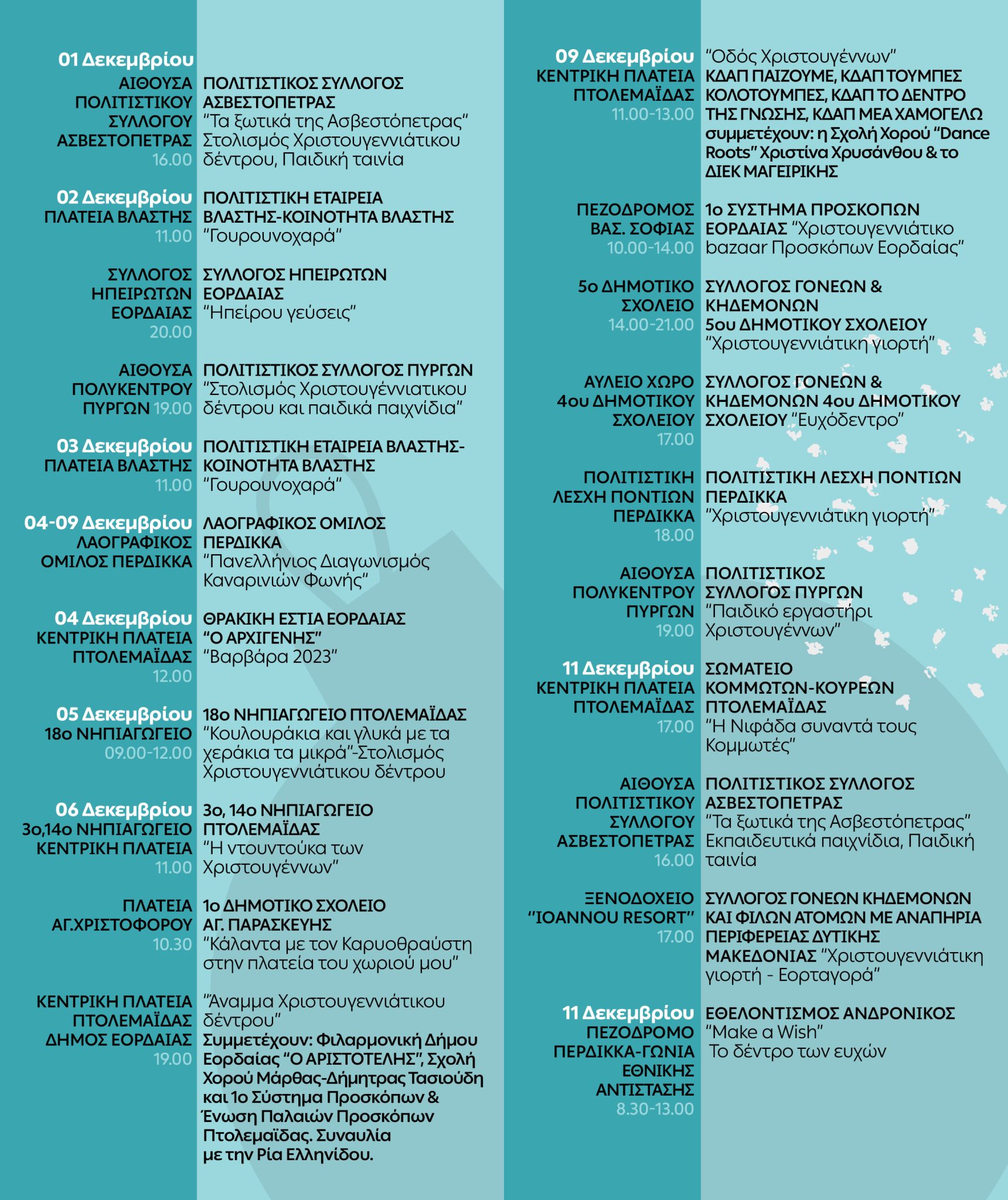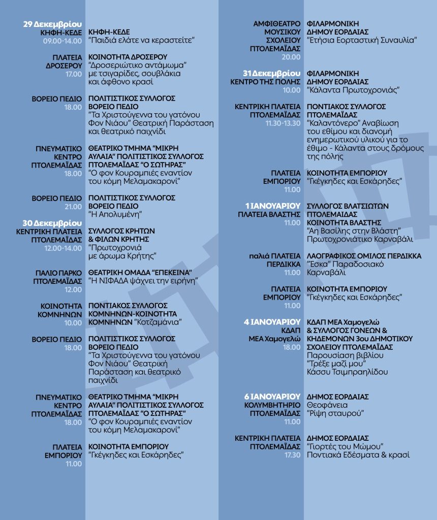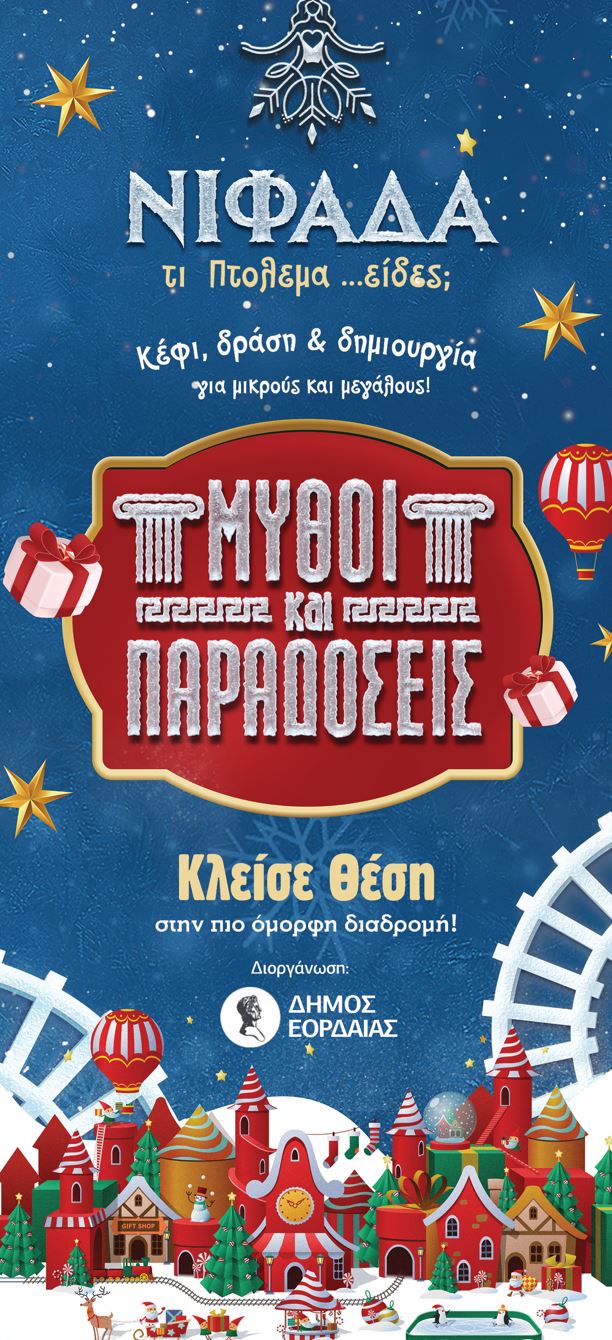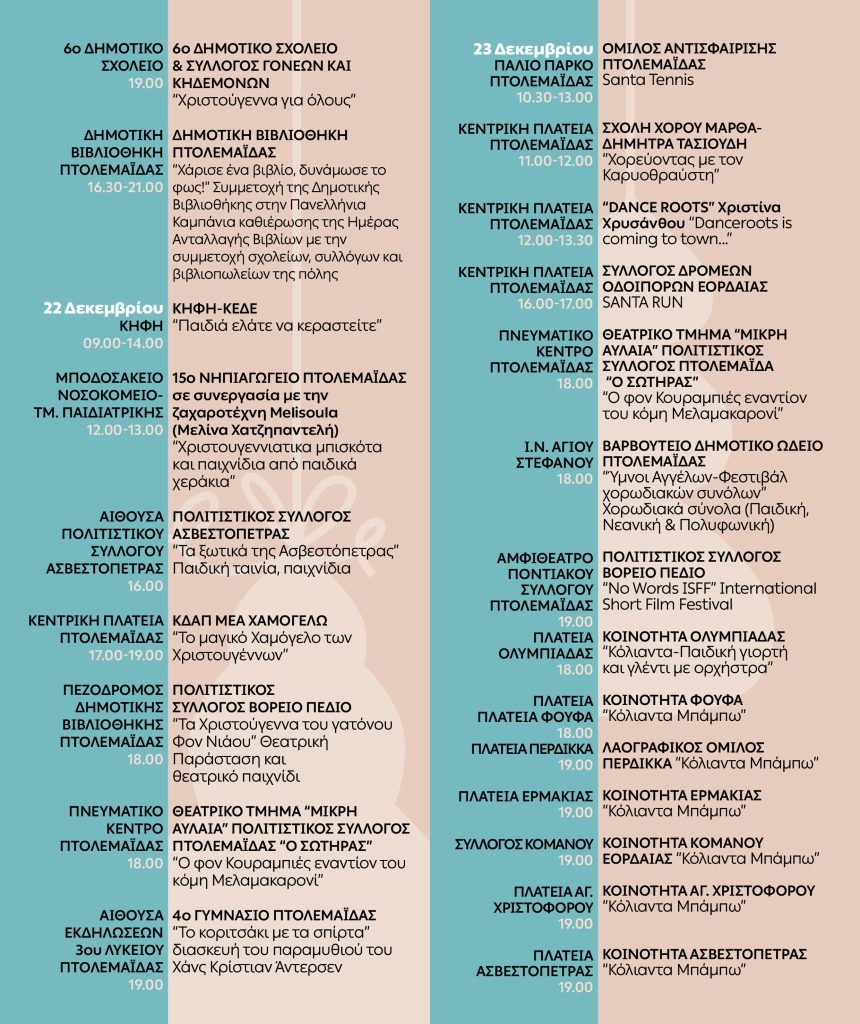 Κέφι, δράση και δημιουργία για μικρούς και μεγάλους, υπόσχεται το εορταστικό πρόγραμμα που ετοίμασε για τα φετινά Χριστούγεννα ο Δήμος Εορδαίας, σε συνεργασία με τις Τοπικές Κοινότητες και φορείς του Δήμου, με την επωνυμία «Νιφάδα τι Πτολεμα …είδες;», το οποίο παρουσιάστηκε σε συνέντευξη τύπου σήμερα Παρασκευή από τον Δήμαρχο Εορδαίας Παναγιώτη Πλακεντά, τον πρόεδρο του Εμπορικού Συλλόγου Πτολεμαΐδας – Εορδαίας Θεόδωρο Βυθούλκα και τον εντεταλμένο σύμβουλο του Δήμου σε θέματα Πολιτισμού Δημήτριο Καρακασίδη, οι οποίοι απηύθυναν κάλεσμα συμμετοχής σε όλο τον κόσμο της ευρύτερης περιοχής.