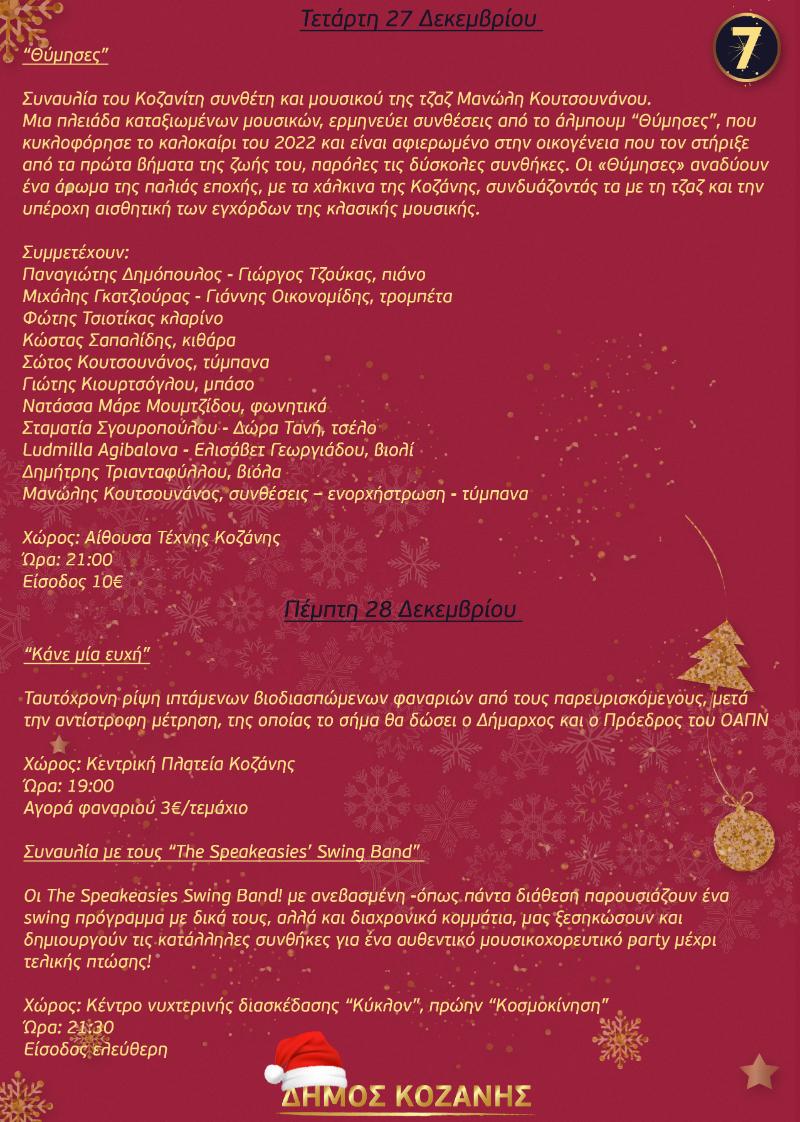 Διαδραστικές παραστάσεις, μουσικές εκδηλώσεις, συναυλίες, εργαστήρια, λευκή νύχτα σε συνεργασία με τον Εμπορικό Σύλλογο Κοζάνης, εθιμικά δρώμενα, πάρτι, φαναράκια, πυροτεχνήματα και πολλά άλλα, υπόσχονται να προσφέρουν νότες χαράς και γιορτής στους κατοίκους και στους επισκέπτες της πόλης και των τοπικών της κοινοτήτων.