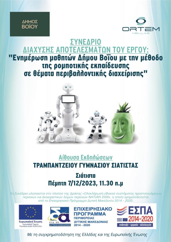 Το συνέδριο πραγματοποιείται στο πλαίσιο της πράξης με τίτλο «Ενημέρωση μαθητών Δήμου Βοΐου με τη μέθοδο Ρομποτικής Εκπαίδευσης σε θέματα Περιβαλλοντικής Διαχείρισης», που υλοποιείται στο πλαίσιο της δράσης «Ολοκλήρωση Εθνικού Συστήματος προστατευόμενων περιοχών και διαχειριστικών δομών περιοχών NATURA 2000, η οποία χρηματοδοτείται από το επιχειρησιακό πρόγραμμα Δυτική Μακεδονία 2014-2020.