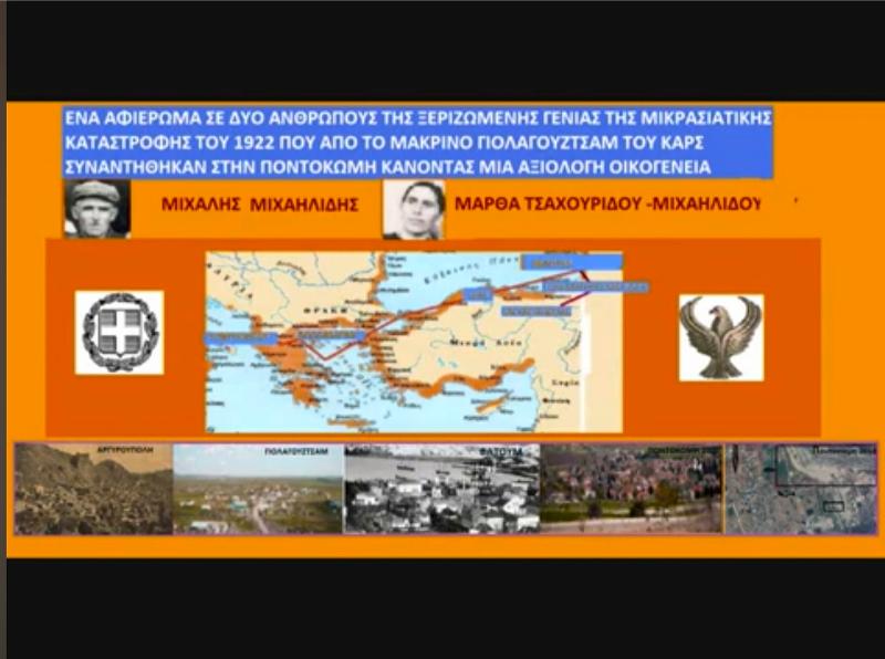 Είναι ζωή δυο απλών ανθρώπων που έζησαν το μεγαλύτερο δράμα των Ελλήνων την Μικρασιατική καταστροφή του 1922 Σε μικρή ηλικία βρεθήκαν στην Ποντοκώμη Κοζανης ξεκινώντας από το μακρινό Καρς που σήμερα κατέχεται από τους Τούρκους . Παντρεύτηκαν έκαναν 6 παιδιά 2 αγόρια και 4 κορίτσια που ο κόσμος γι’αυτούς και τα παιδιά τους μόνο καλά λόγια είχαν να πουν.