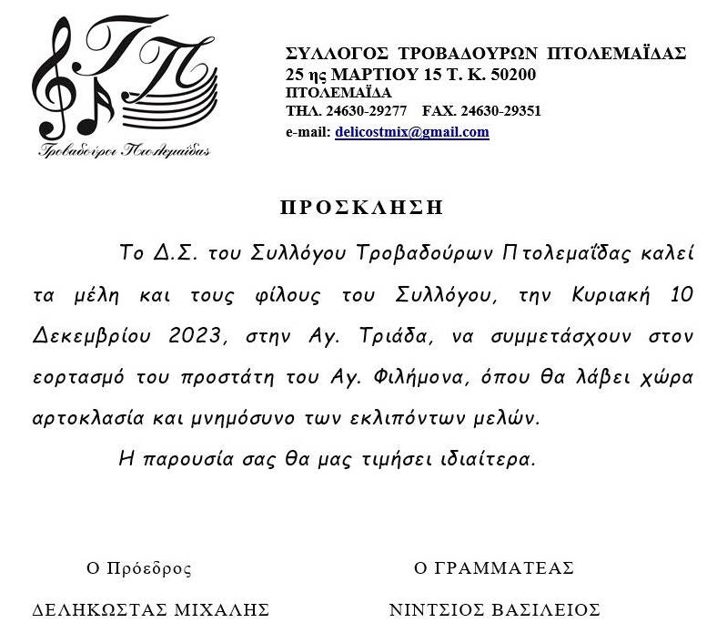 Εκδήλωση του Συλλόγου Τροβαδούρων Πτολεμαΐδας για τον προστάτη του Άγιο Φιλήμονα: