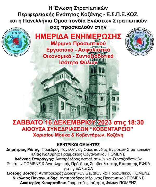 Η Ένωση Στρατιωτικών Περιφερειακής Ενότητας Κοζάνης, σας προσκαλεί στην ημερίδα ενημέρωσης που διοργανώνει, σε συνεργασία με την Πανελλήνια Ομοσπονδία Ενώσεων Στρατιωτικών (Π.ΟΜ.Ε.Ν.Σ), το Σάββατο 16 Δεκεμβρίου 2023 και ώρα 18:30, στην αίθουσα συνεδριάσεων του δήμου Κοζάνης “ΚΟΒΕΝΤΑΡΕΙΟ” Χαρισίου Μούκα & Κοβενταρων Κοζάνη, με θέματα: