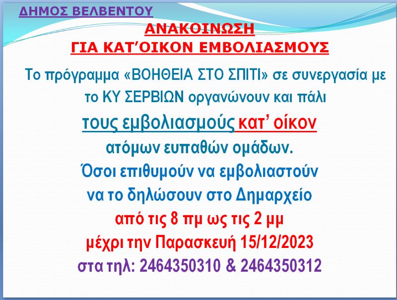 Το πρόγραμμα «ΒΟΗΘΕΙΑ ΣΤΟ ΣΠΙΤΙ» σε συνεργασία με το ΚΥ ΣΕΡΒΙΩΝ οργανώνουν και πάλι τους εμβολιασμούς κατ’ οίκον ατόμων ευπαθών ομάδων.