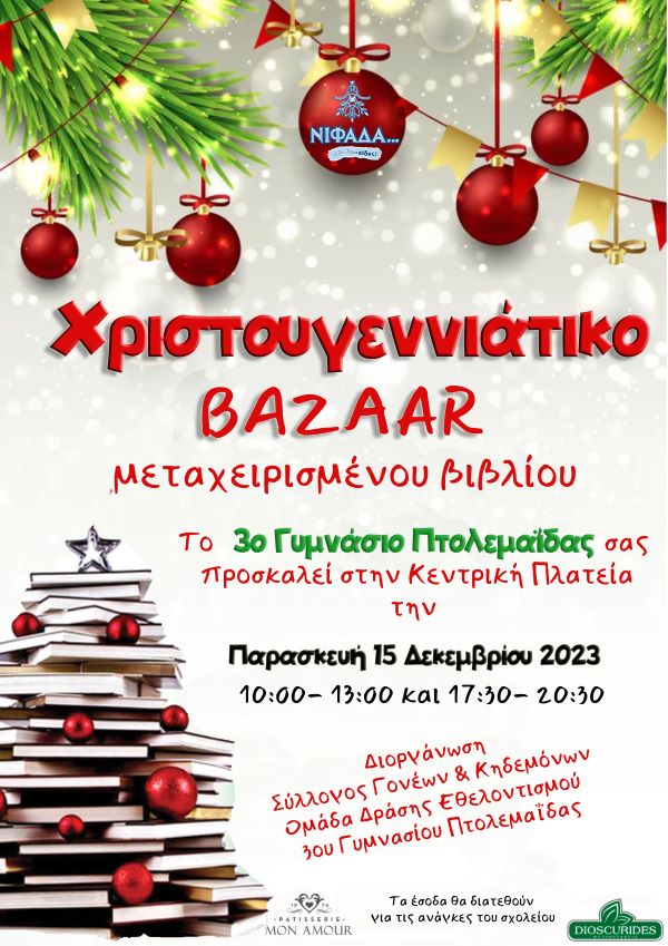 • “Χριστουγεννιάτικο Παζάρι μεταχειρισμένων βιβλίων” στην Κεντρική πλατεία Πτολεμαΐδας από 10:00-13:00 και 17:30- 20:30, από το 3ο Γυμνάσιο Πτολεμαΐδας και το Σύλλογο Γονέων & Κηδεμόνων.