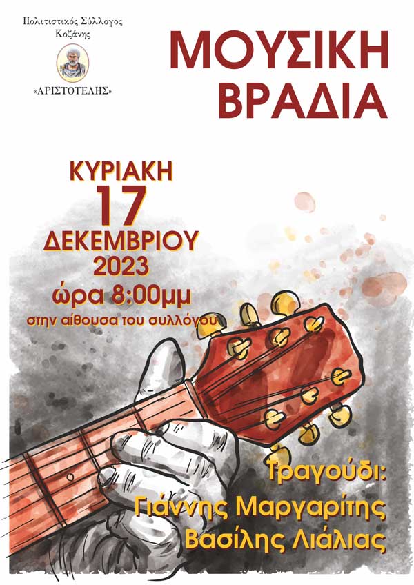 Κοζάνη 15/12/2023 Μουσική βραδιά διοργανώνει ο Πολιτιστικός Σύλλογος “Αριστοτέλης” 0 Ο Πολιτιστικός Σύλλογος “ΑΡΙΣΤΟΤΕΛΗΣ” Κοζάνης, διοργανώνει μουσική βραδιά την Κυριακή 17 Δεκεμβρίου 2023 και ώρα 8:00μμ, στην αίθουσα του συλλόγου. Στο τραγούδι ο Γιάννης Μαργαρίτης και ο Βασίλης Λιάλιας.