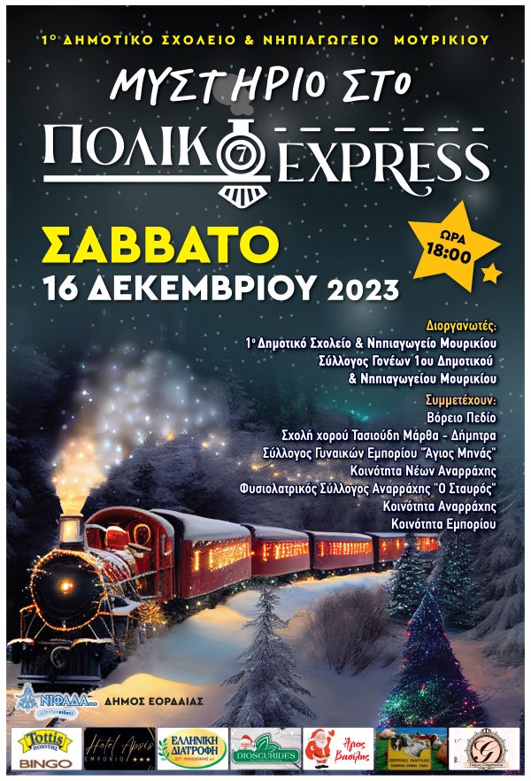 - “Πολικό Εξπρές 7” Φεστιβάλ παιδικής δημιουργίας και ευρηματικού παιχνιδιού από το 1ο Δημοτικό Σχολείο & Νηπιαγωγείο Μουρικίου και το Σύλλογο Γονέων & Κηδεμόνων στις 18.00 στο 1ο Δημοτικό Σχολείο & Νηπιαγωγείο Μουρικίου.
