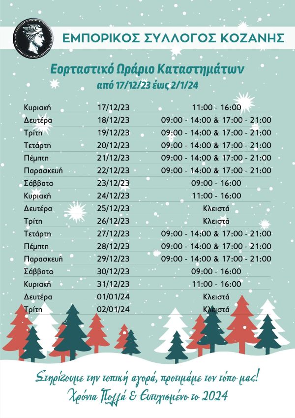 Ανοιχτά θα είναι τα εμπορικά καταστήματα την Κυριακή 17 Δεκεμβρίου στην Κοζάνη, αλλά και πανελλαδικά στο πλαίσιο του εορταστικού ωραρίου των Χριστουγέννων .