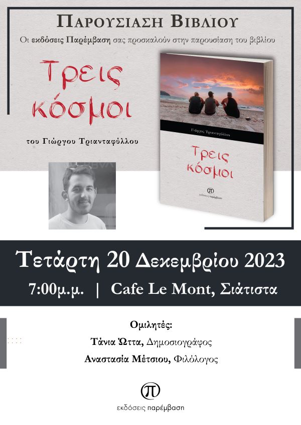 Παρουσίαση του βιβλίου «Τρεις κόσμοι» του Γιώργου Τριανταφύλλου από τις Εκδόσεις Παρέμβαση θα πραγματοποιηθεί την Τετάρτη 20 Δεκεμβρίου, στις 7.00, στο καφέ Le Mont στη Σιάτιστα.