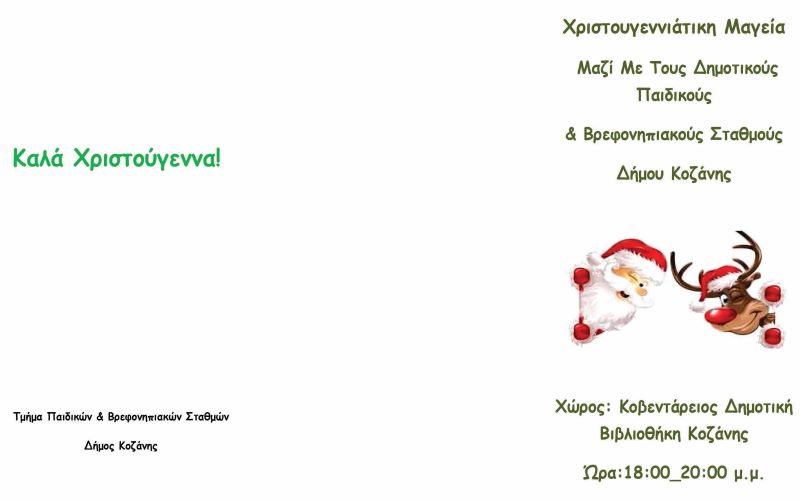 Το Τμήμα Παιδικών και Βρεφονηπιακών Σταθμών της Διεύθυνσης Κοινωνικής Προστασίας Παιδείας και Πολιτισμού του Δήμου Κοζάνης συμμετέχει στις Χριστουγεννιάτικες Δράσεις του Δήμου στο χώρο της Κοβενταρείου Δημοτικής Βιβλιοθήκης :