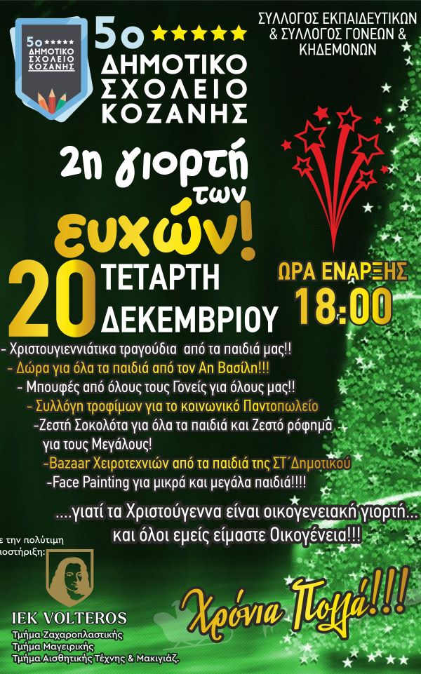 Η 2η Γιορτή των Ευχών του Σχολείου μας έφτασε και φέτος .Να ακούσουμε τα κάλαντα από τα παιδιά μας, να γνωριστούμε, να ανταλλάξουμε ευχές, να κεραστούμε, να μάθουμε και στα παιδιά μας την έννοια της προσφοράς μέσω του bazaar που ετοιμάζουν, να μυρίσουν Χριστούγεννα!