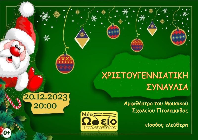 Η διεύθυνση, το καλλιτεχνικό προσωπικό και οι σπουδαστές του Νέου Ωδείου Πτολεμαΐδας προσκαλούν όλους τους φίλους της μουσικής στην Χριστουγεννιάτικη Συναυλία που θα γίνει στις 20/12/2023 – Τετάρτη, στις 8:00 μ.μ. στο αμφιθέατρο του Μουσικού Σχολείου Πτολεμαΐδας. Η είσοδος για το κοινό είναι ελεύθερη!