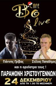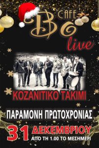 Την Παραμονή των Χριστουγέννων στο BO CAFE μπορείτε να απολαύσετε σε παραδοσιακούς & χάλκινους ρυθμούς με τον Γιάννη Γρίβα στο κλαρίνο, τον Στέλιο Παπαδήμο στο τραγούδι και την ορχήστρα τους, ενώ την Κυριακή 31 Δεκεμβρίου με το ‘Κοζανίτικο Τακίμι’.