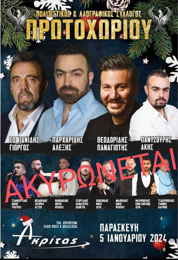 Κοζάνη 29/12/2023 Ο χειμερινός χορός του Πολιτιστικού και Λαογραφικού Συλλόγου Πρωτοχωρίου στις 5/1 ακυρώνεται λόγω πένθους 0 Ο χειμερινός χορός του Πολιτιστικού και Λαογραφικού Συλλόγου Πρωτοχωρίου στις 5/1 ακυρώνεται λόγω πένθους