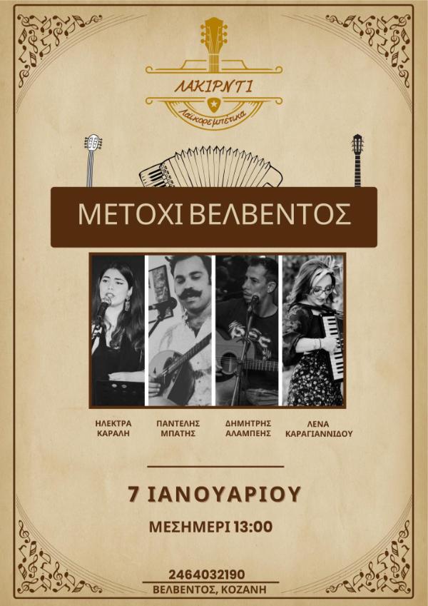 Live με λαϊκορεμπέτικα από τους Λακιρντί στο εστιατόριο “Μετόχι” Βελβεντού, από το μεσημέρι της Κυριακής 7 Ιανουαρίου 2024.