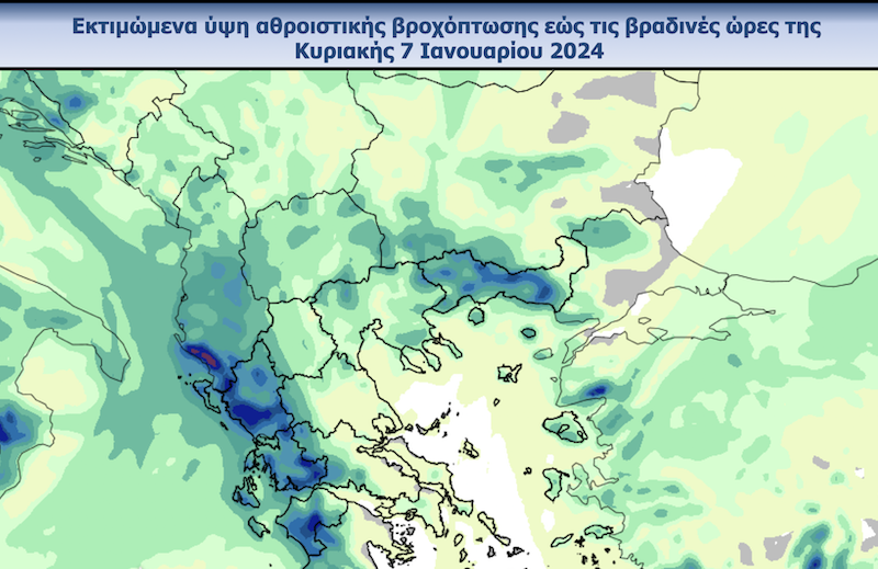 Στον παρακάτω χάρτη παρουσιάζεται το αθροιστικό ύψος βροχής που αναμένεται έως τις βραδινές ώρες της Κυριακής 07/01.