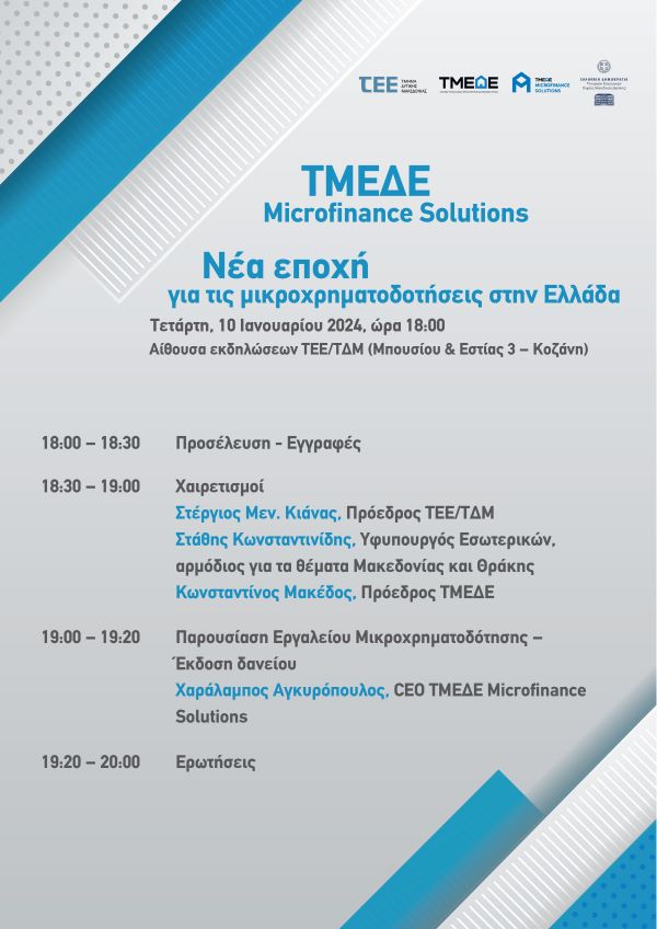 Την Τετάρτη 10 Ιανουαρίου στις 18:00, θα πραγματοποιηθεί ενημερωτική εκδήλωση στην αίθουσα εκδηλώσεων του Τμήματος Δυτικής Μακεδονίας του ΤΕΕ (Μπουσίου & Εστίας 3), στην Κοζάνη, με θέμα «ΤΜΕΔΕ Microfinance Solutions – Νέα εποχή για τις μικροχρηματοδοτήσεις στην Ελλάδα».