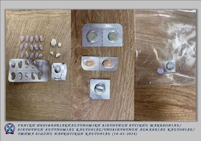 • το βράδυ της 04-01-2024 στην Καστοριά, αστυνομικοί του Τμήματος Δίωξης Ναρκωτικών της Υποδιεύθυνσης Ασφάλειας Καστοριάς, συνέλαβαν 43χρονο ημεδαπό, διότι στην κατοχή του βρέθηκαν και κατασχέθηκαν -19- δισκία και -2- τμήματα δισκίων που εμπίπτουν στις διατάξεις του νόμου περί ναρκωτικών, την κατοχή των οποίων δεν μπόρεσε να δικαιολογήσει,