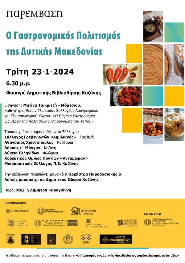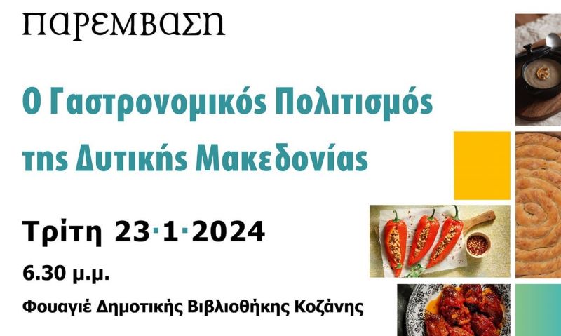 Το λογοτεχνικό περιοδικό & φορέας Πολιτισμού «Παρέμβαση» διοργανώνει εκδήλωση με θέμα «Ο Γαστρονομικός Πολιτισμός της Δυτικής Μακεδονίας», την Τρίτη 23 Ιανουαρίου, ώρα 6:30 μ.μ., στο Φουαγιέ της Δημοτικής Βιβλιοθήκης Κοζάνης.
