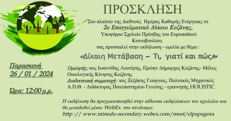 Στο πλαίσιο της Διεθνούς Ημέρας Καθαρής Ενέργειας το 2ο Επαγγελματικό Λύκειο Κοζάνης, Υποψήφιο Σχολείο Πρέσβης του Ευρωπαϊκού Κοινοβουλίου, θα πραγματοποιήσει εκδήλωση με θέμα τη «Δίκαιη Μετάβαση — Τι, γιατί και πώς».