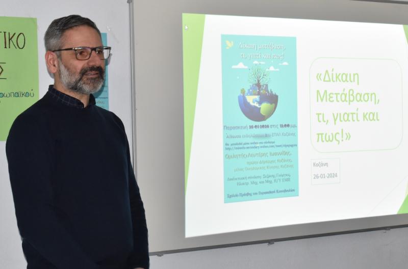 Σε ενημερωτική εκδήλωση του 2ου ΕΠΑΛ Κοζάνης με τίτλο «Δίκαιη Μετάβαση, τι, γιατί και πως!» και κεντρικό ομιλητή τον πρώην Δήμαρχο Κοζάνης και μέλος της Οικολογικής Κίνησης Λευτέρη Ιωαννίδη, παρέστη το μεσημέρι της Παρασκευής 26 Ιανουαρίου 2024, ο Δήμαρχος Κοζάνης Γιάννης Κοκκαλιάρης.