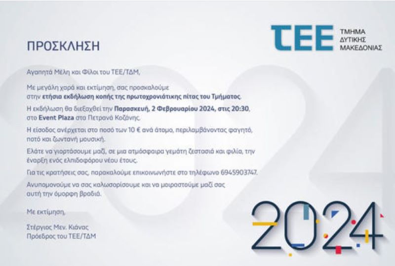 Με μεγάλη χαρά και εκτίμηση, σας προσκαλούμε στην ετήσια εκδήλωση κοπής της πρωτοχρονιάτικης πίτας του Τμήματος. Η εκδήλωση θα διεξαχθεί την Παρασκευή, 2 Φεβρουαρίου 2024, στις 20:30, στο Event Plaza στα Πετρανά Κοζάνης.
