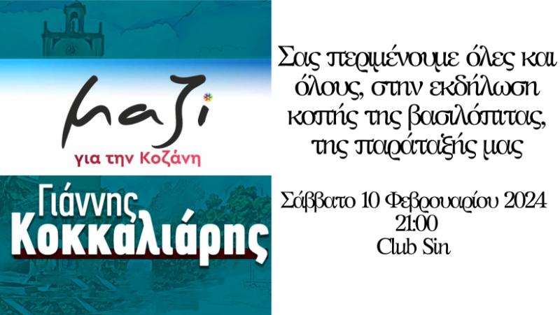 Τη βασιλόπιτά της κόβει η παράταξη “Μαζί για την Κοζάνη” το Σάββατο 10 Φεβρουαρίου 2024 στις 21:00 το βράδυ στο club “Sin”.
